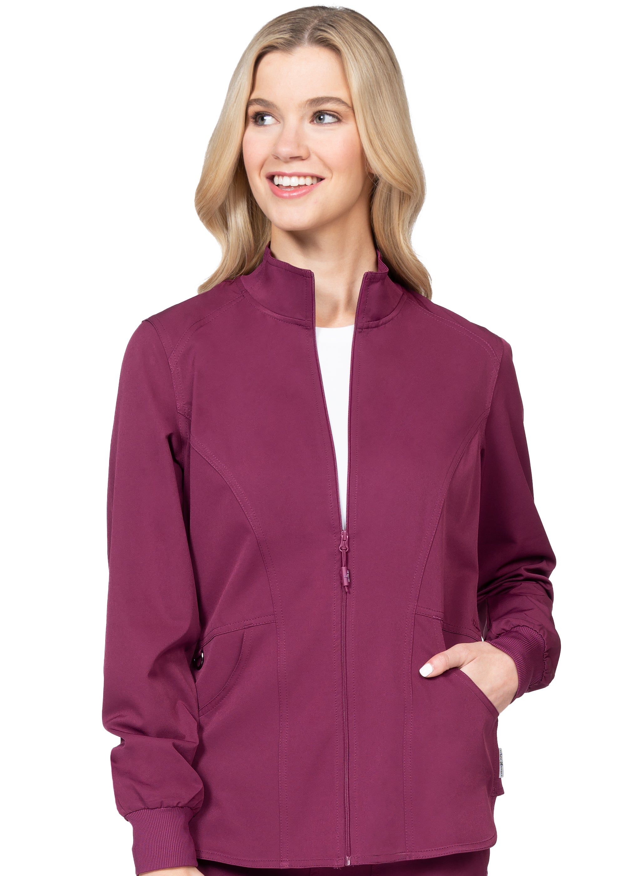 - Stand collar with rib knit panel for comfort