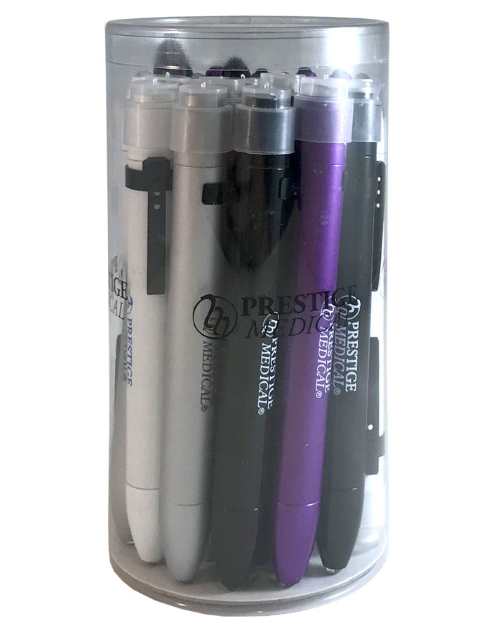 This penlight is push button activated and features metal construction, soft LED illumination and includes 1-AAA battery. Features a pupil gauge imprint on the side.