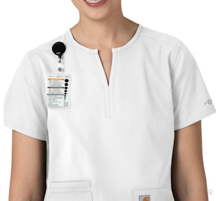 - Feature 1: Notch neckline that sits above the collar bone with badge ID loop along shoulder seam
