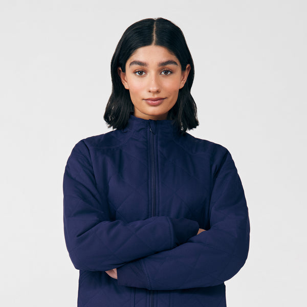 Stay cozy and stylish in this quilted zip-front jacket, designed for a loose, sporty, and contemporary fit. The drop shoulders, knit cuffs, and ribbed bottom band offer enhanced mobility, making it perfect for your active day. Thoughtful details include a hidden cell phone chest pocket, two spacious front pockets, a bungee loop for your badge, and a convenient watch vent on the left sleeve for effortless time checks without the need to roll up your sleeve.