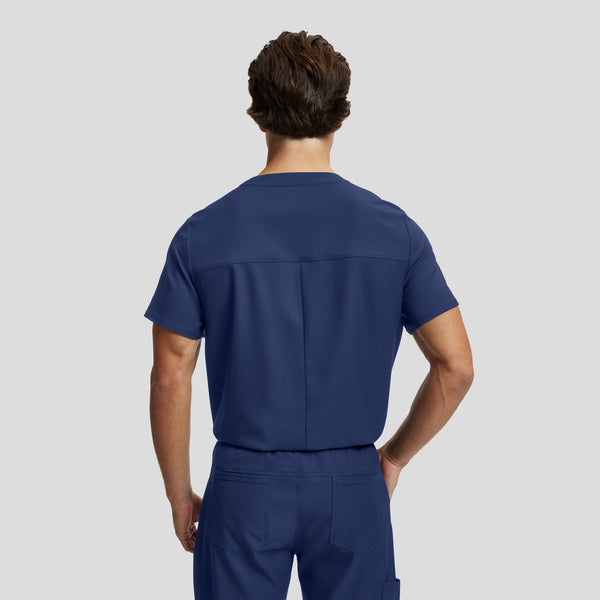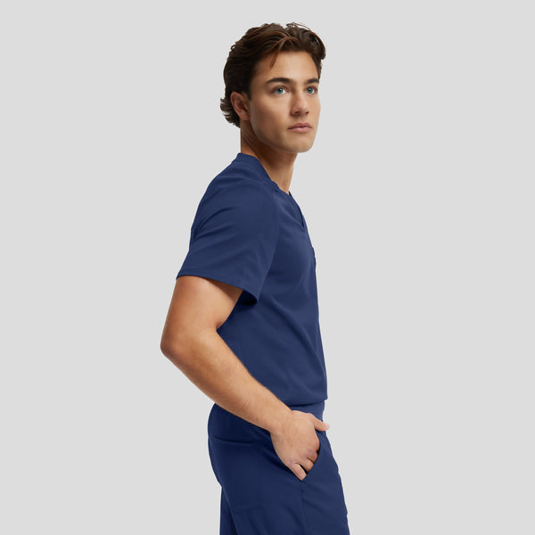 The men's scrub top showcases a sporty yet polished design, seamlessly blending the timeless V-neckline with a tuck-in style for a sharp and stylish appearance. Additionally, this design incorporates a double chest pocket with a dedicated pen slot for added functionality.